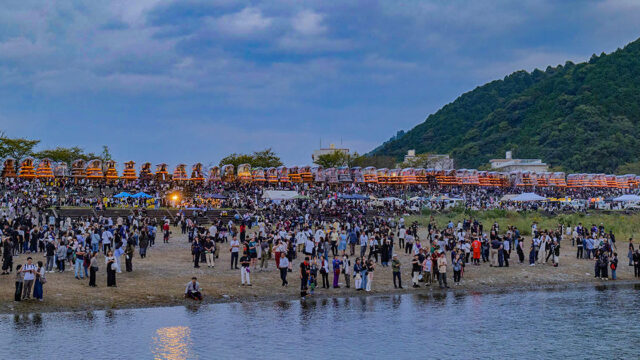 提灯をつけた“だんじり”と呼ばれる巨大な山車が川の中を練り歩く美しい行事で、