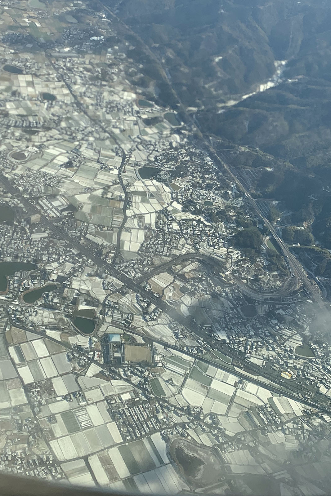 離陸直後。画面中央に見えるのは先ほど出発した松山空港。