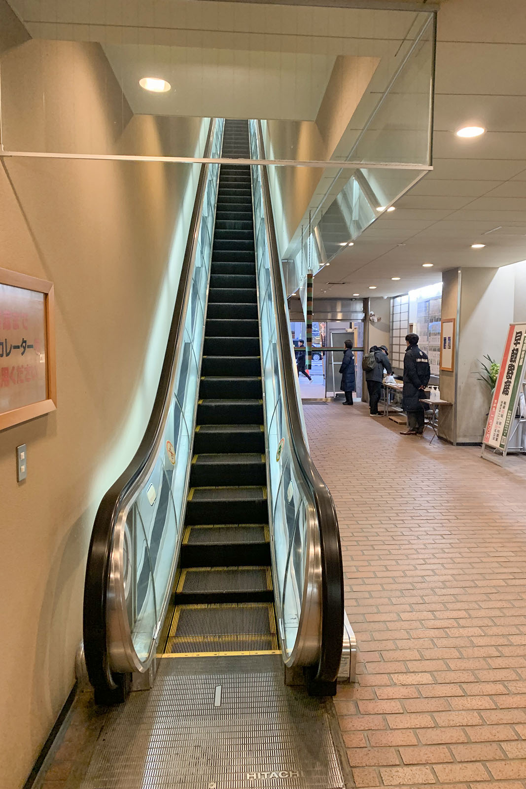 会場の入口へはこの長いエスカレーターで上がり、降りたところでスマホの電源を切るように指示されます。マナーモードや機内モードにはすぐできるんですが切り方が分からず焦ったことは内緒です。