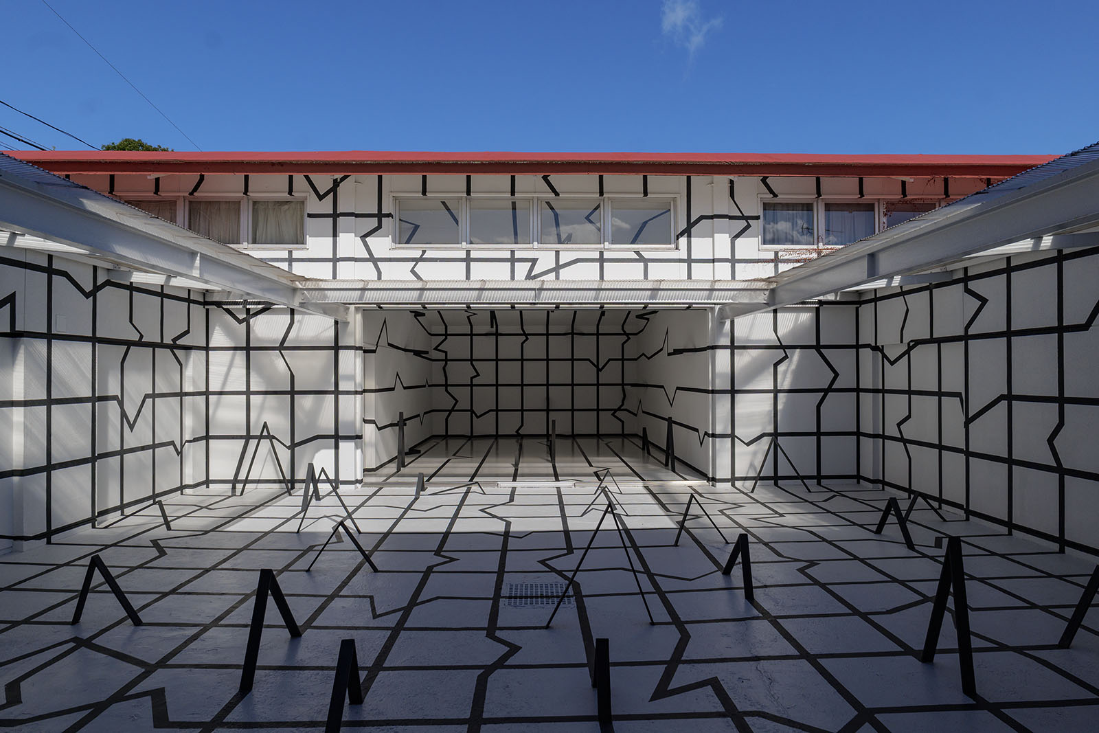 古い家屋に手を加えた作品で、瓦の面を水面(境界)と考えることで、