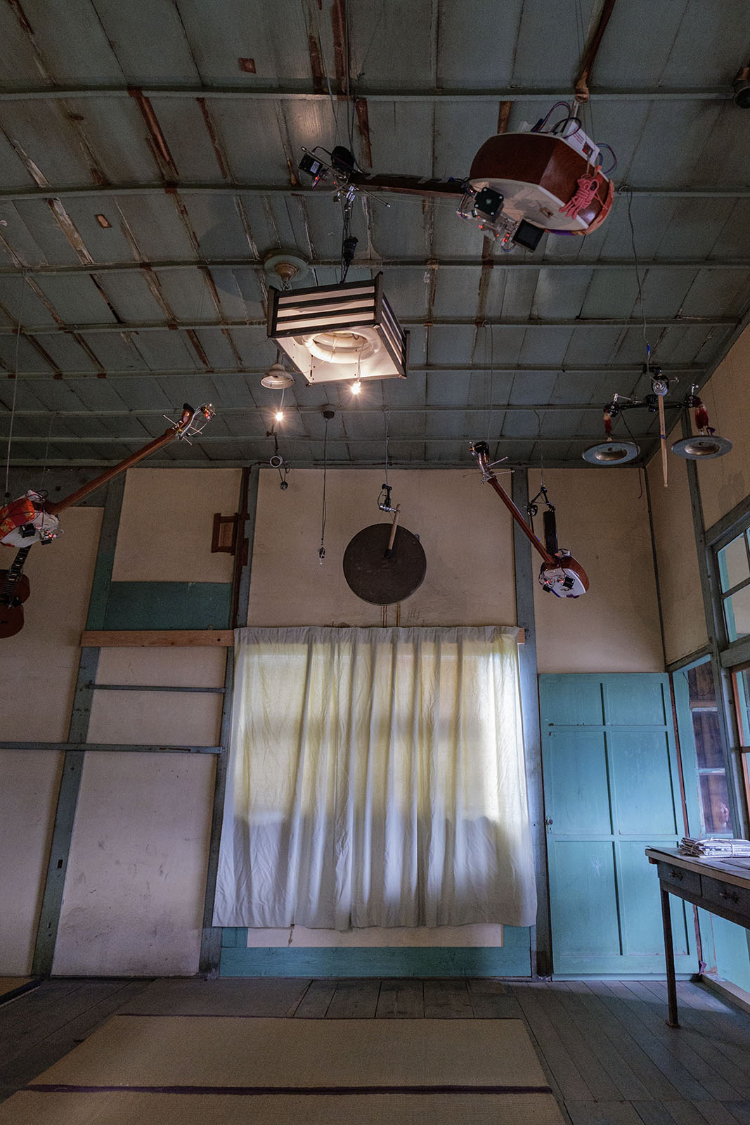 天井から吊るされたさまざまな楽器が、島民などから募集したメッセージをモールス信号に変換して演奏するという作品です。