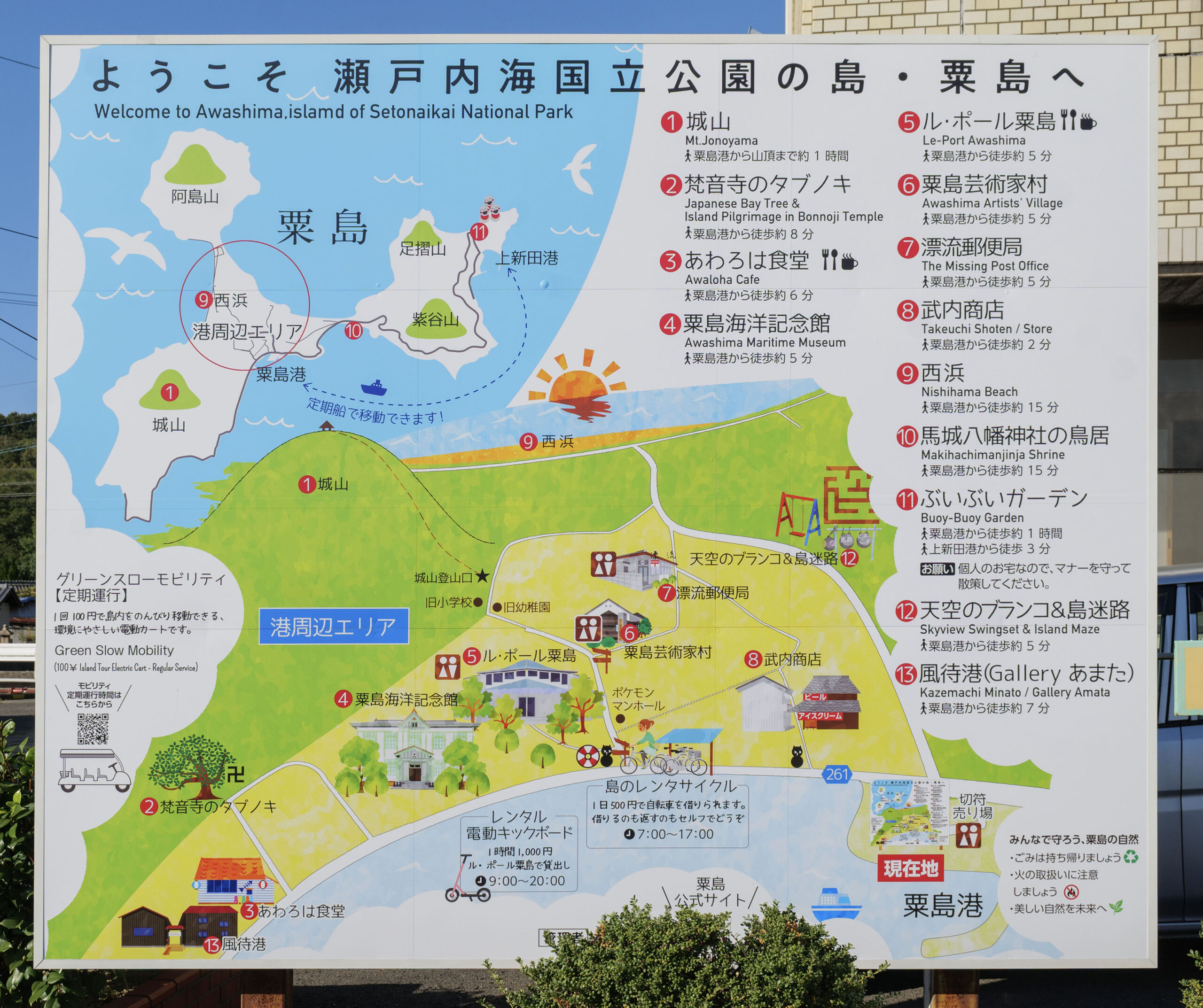 瀬戸芸目的で粟島を訪れる場合、目的地(約7カ所)はすべて港周辺の狭いエリアに集中しています。