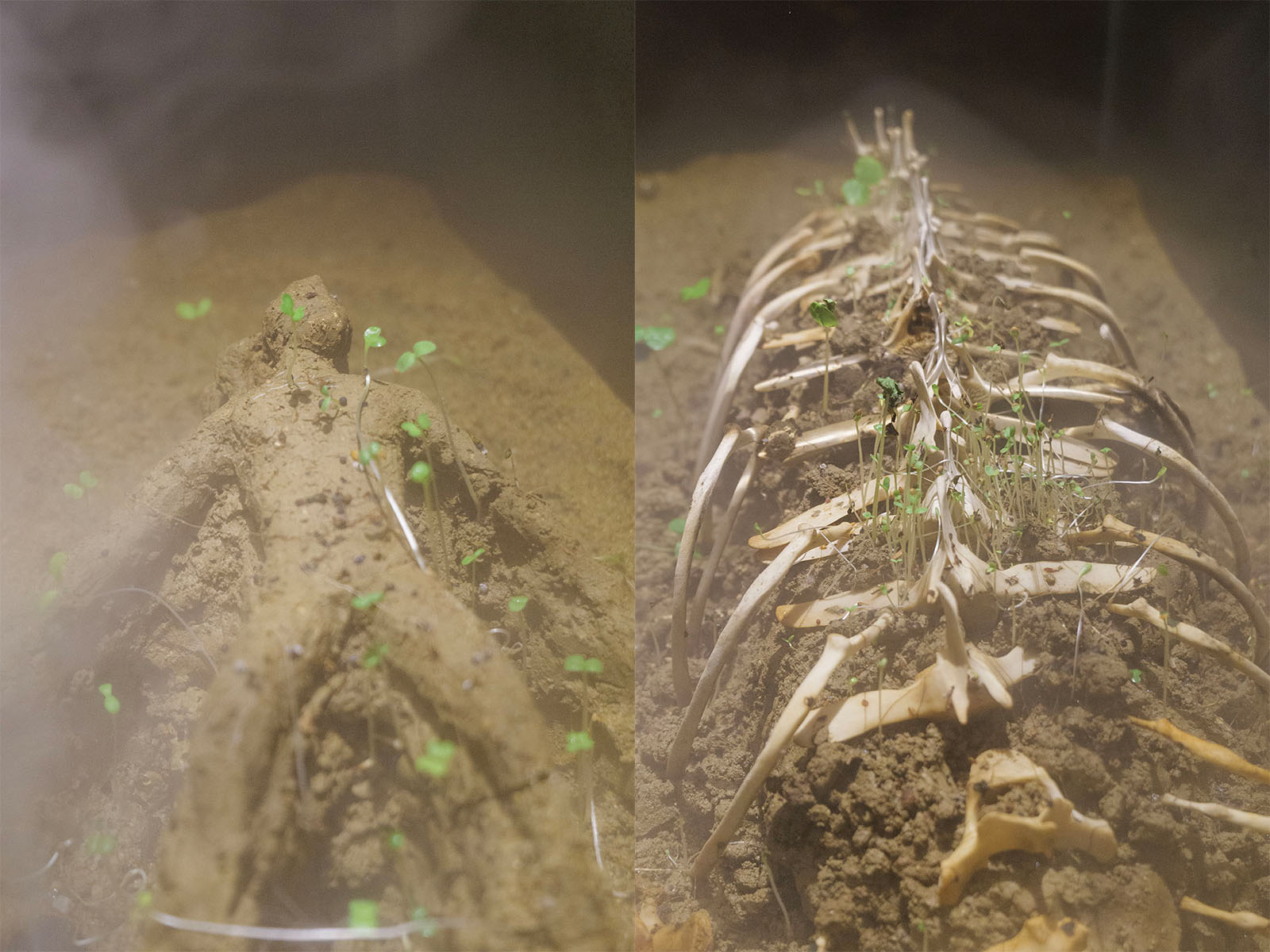 巨大な手から放たれる光によって植物が育っていくという作品。