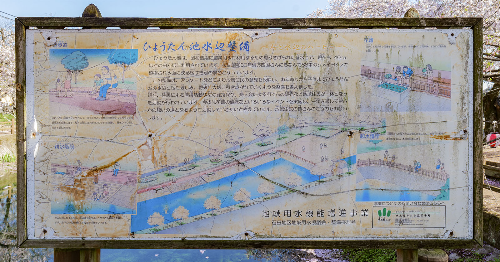 「ひょうたん池」の特徴は、小さな池の周辺を約80本の大きな桜がぐるりと囲んでいること。