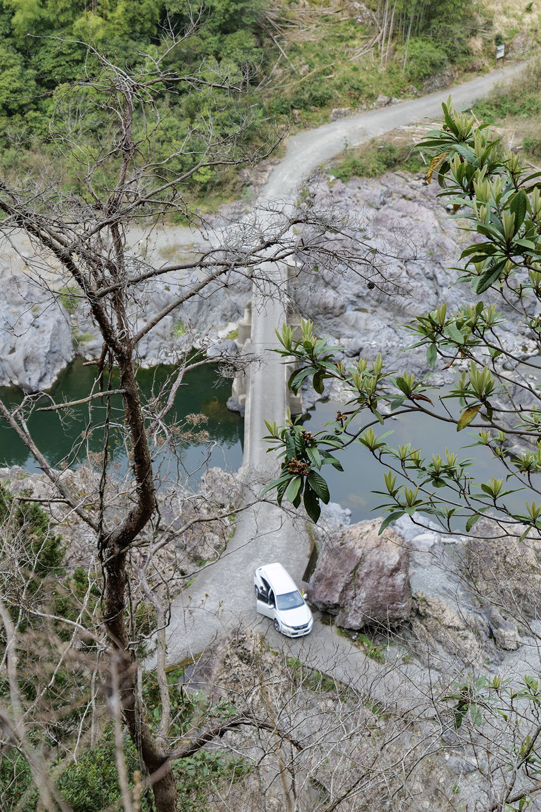 画面左下から横に伸びるのが「仁淀川町役場」からの道で、中央下から白い車の位置に伸びるのが「久喜沈下橋」からの道です。
