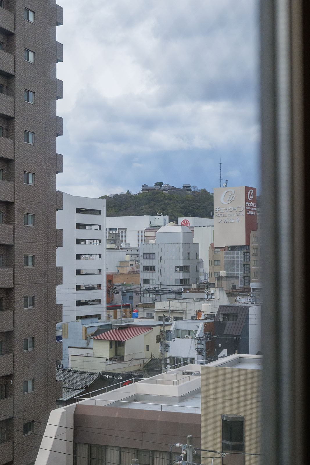 6階でエレベータを降りて、廊下を西端まで進んだところからの眺望です。松山城が見えています。