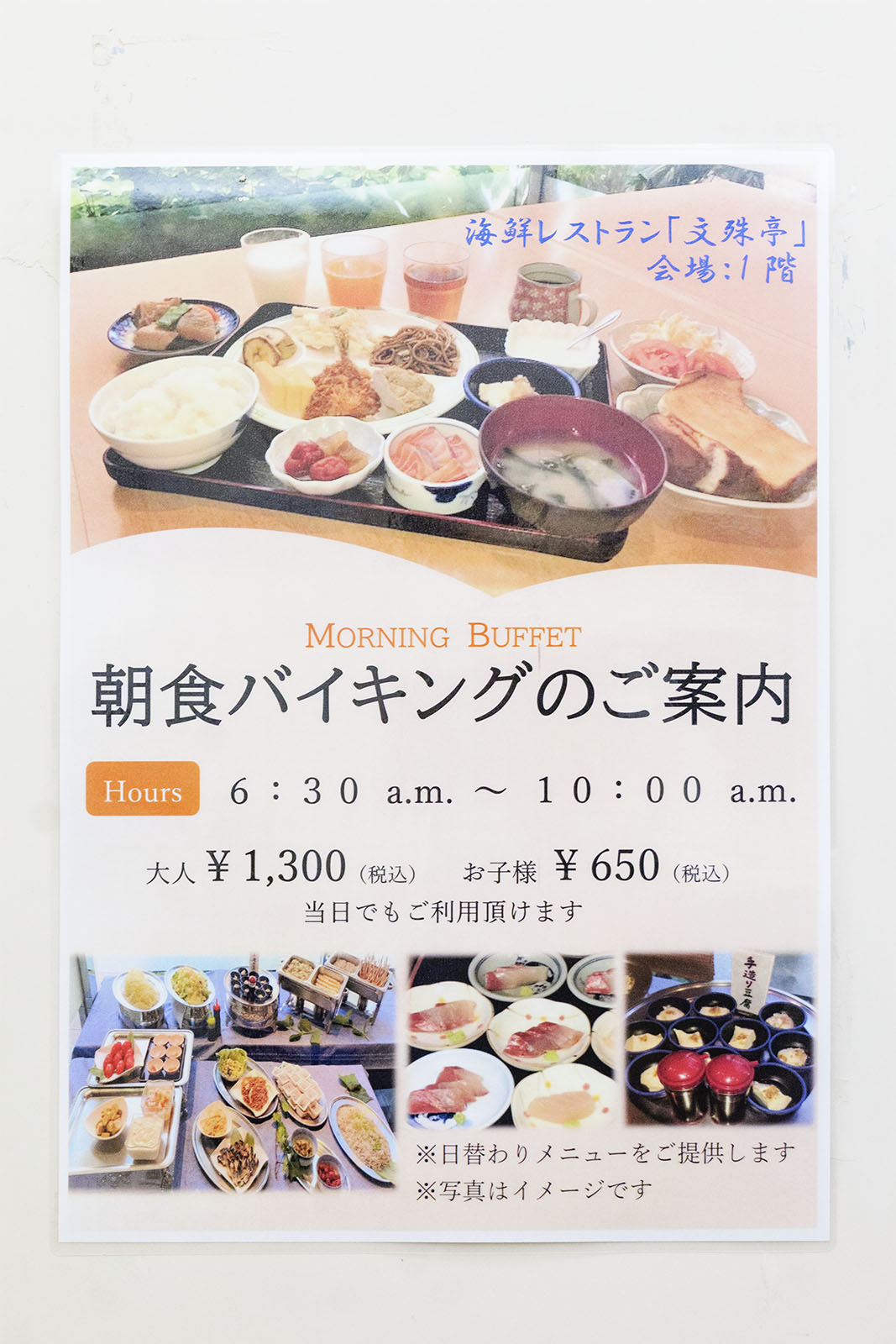 朝食バイキングは1階ロビー横のレストラン「文殊亭」で6時半から10時まで。