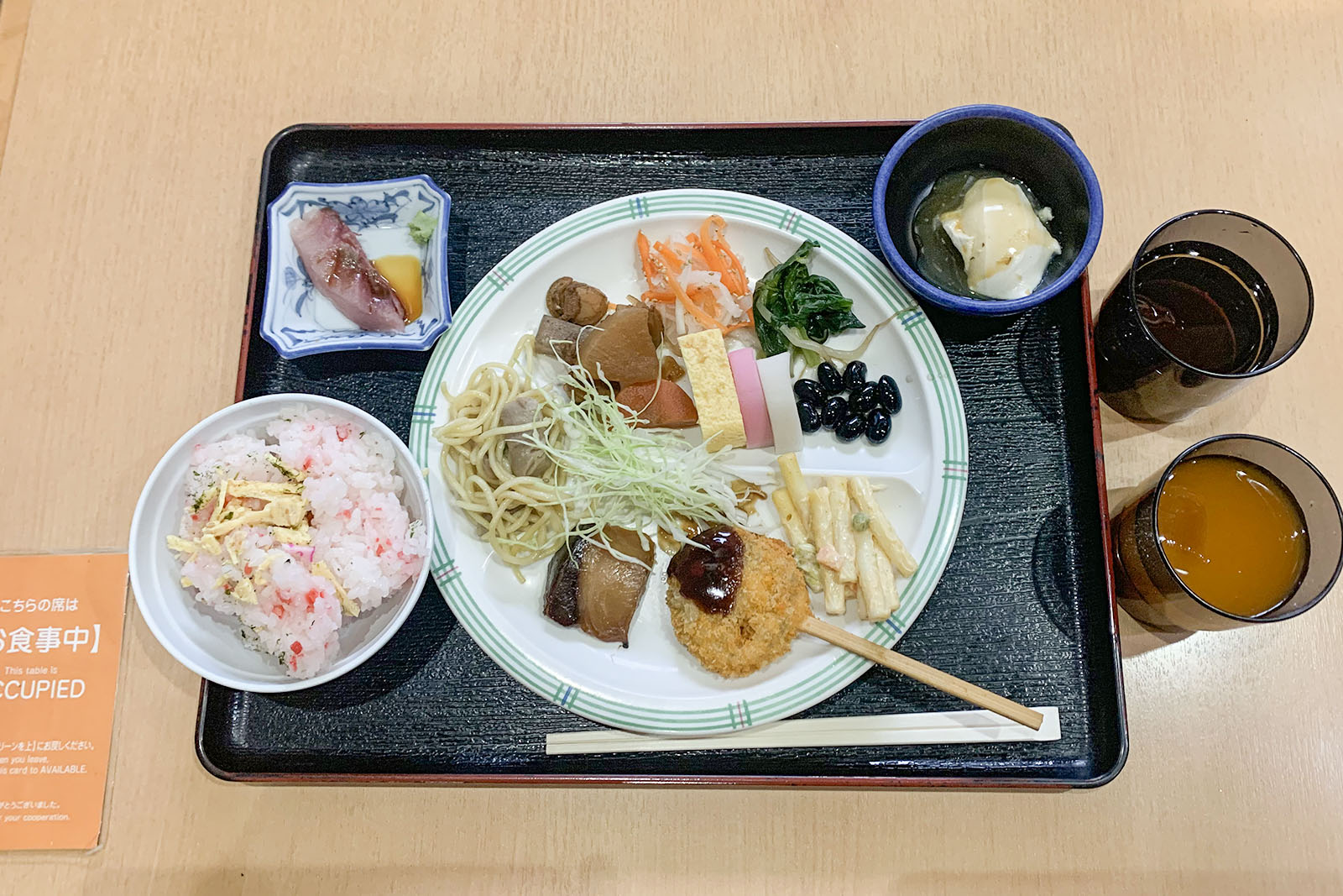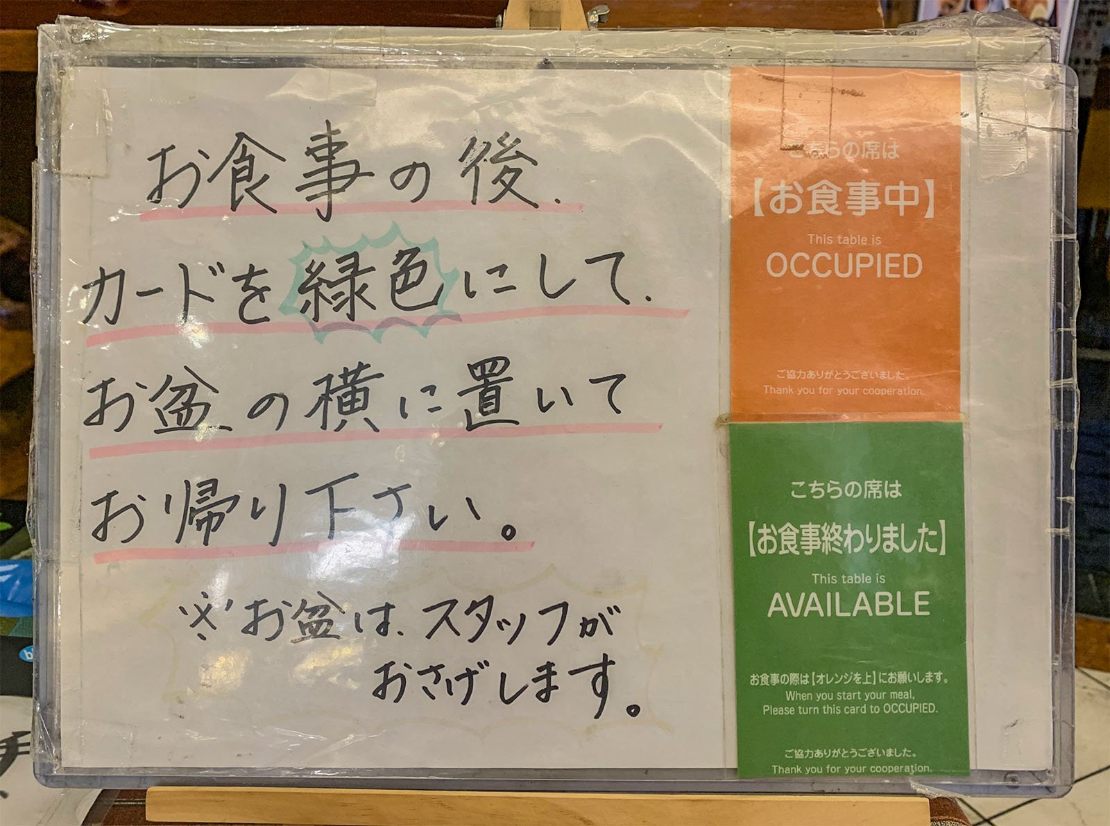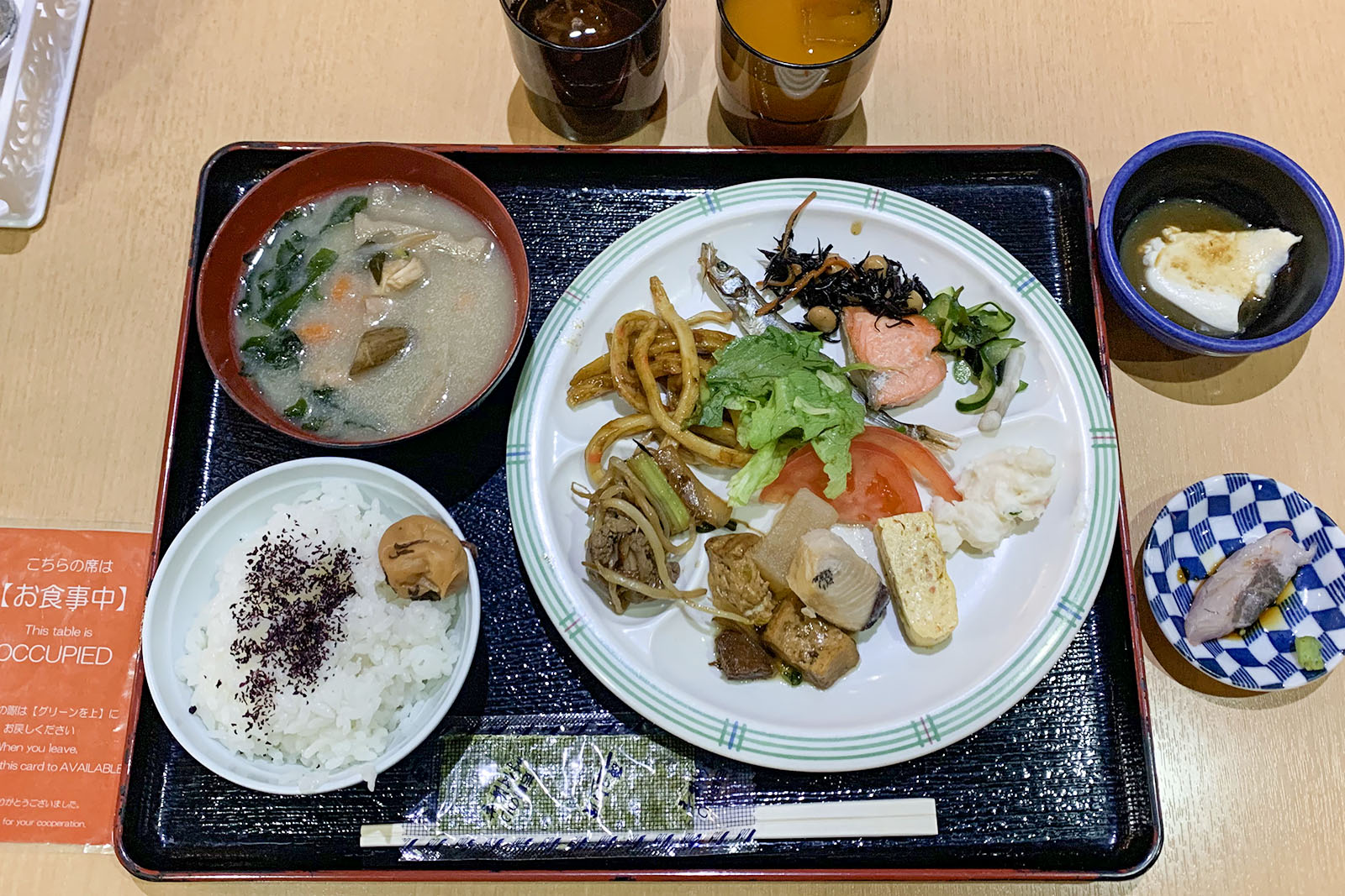 朝食券と引き換えに係の人からいただくこのカードを空いている席に置いて食事場所を確保します。