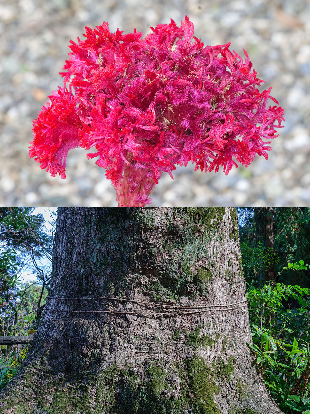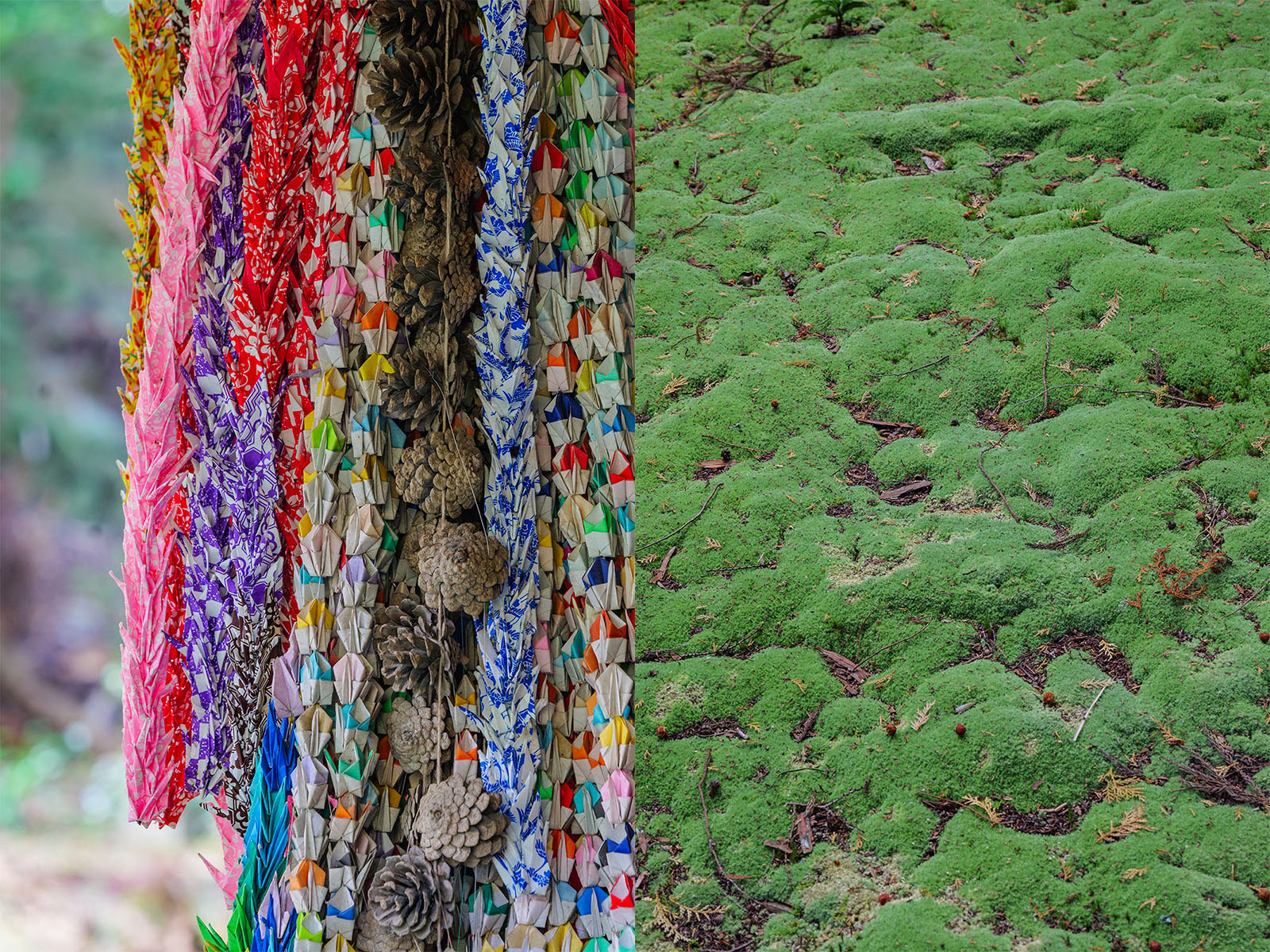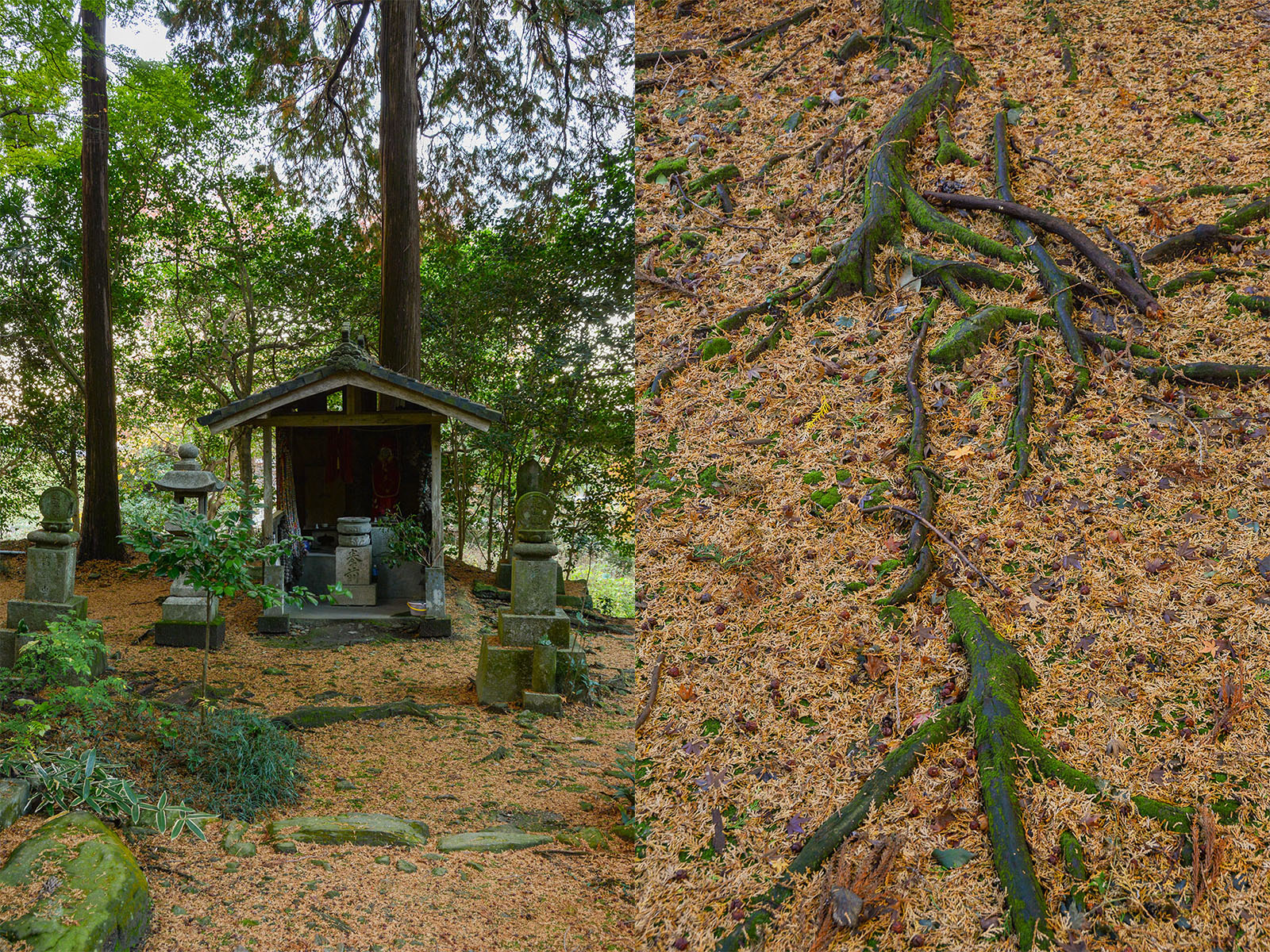 ヒノキ(?)の落ち葉で地面の色が変わっています。