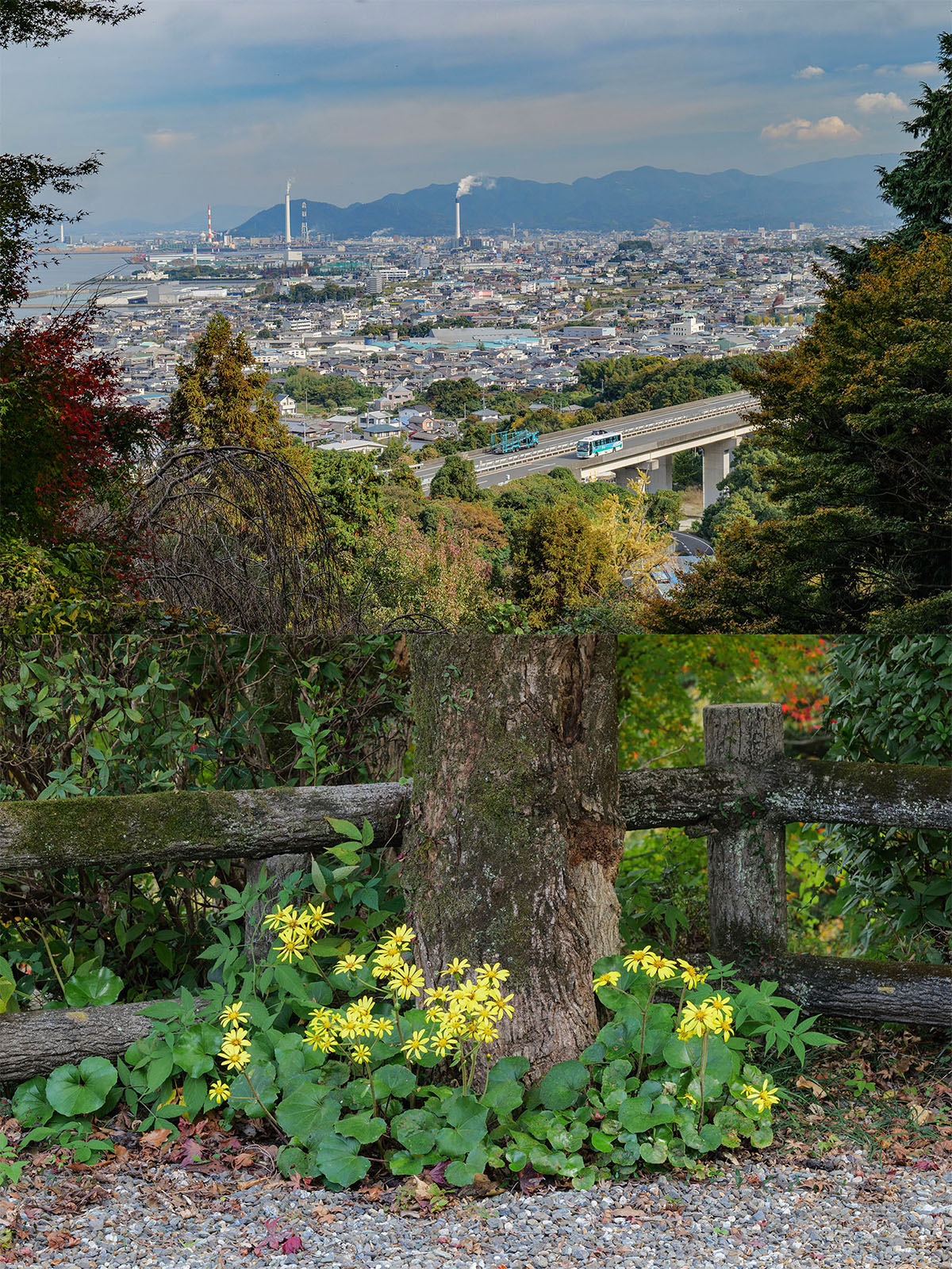本堂付近からは四国中央市の市街地や瀬戸内海を一望できます。